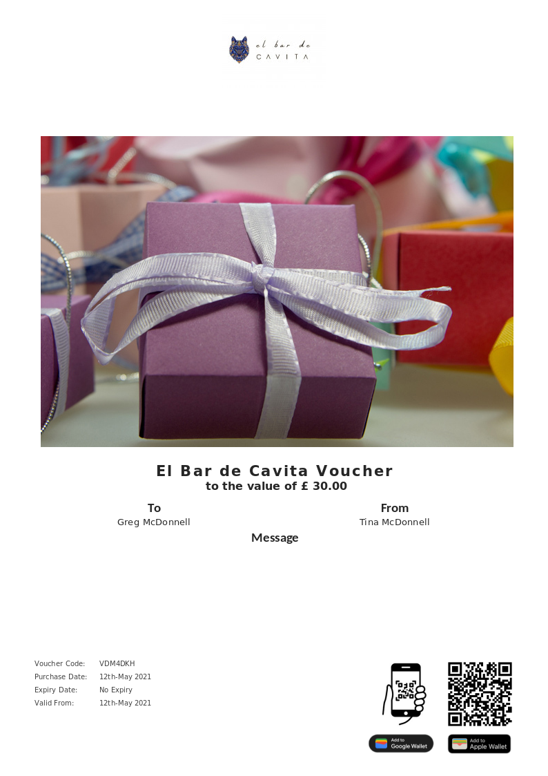 El Bar de Cavita allows you to purchase instantly printable gift vouchers, special offers and tickets using the Voucher Connect platform.